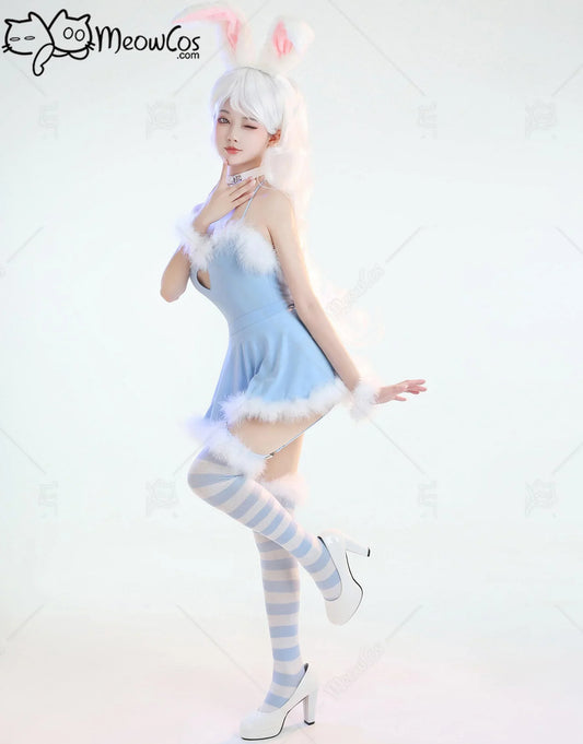 Women Bunny Girl Sexy Lingerie Set Blue Furry Heart Bodysuit with Skirt and Stockings