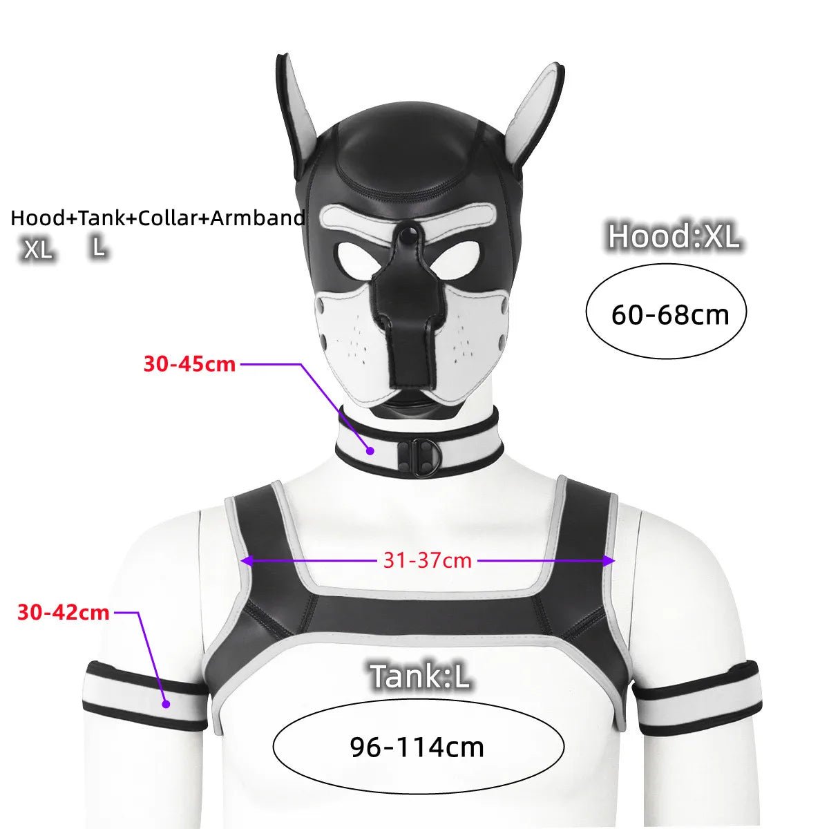 - Complete Set: Includes a fetish hood mask, chest strap, collar, and armband to cater to all your cosplay needs, enhancing role-play scenarios.
