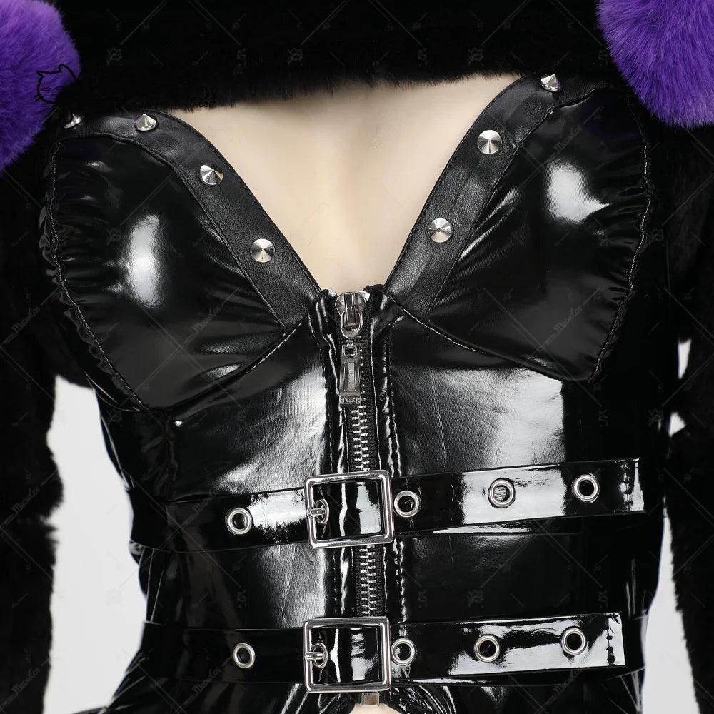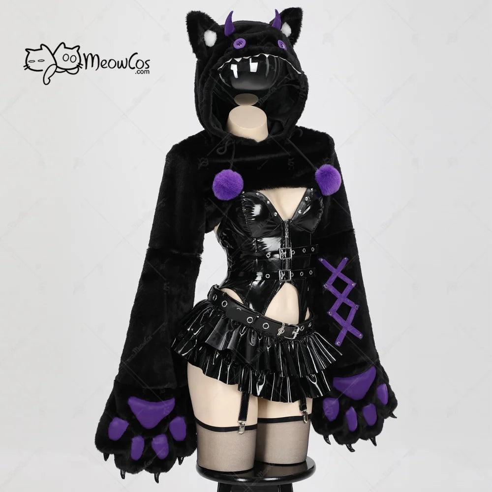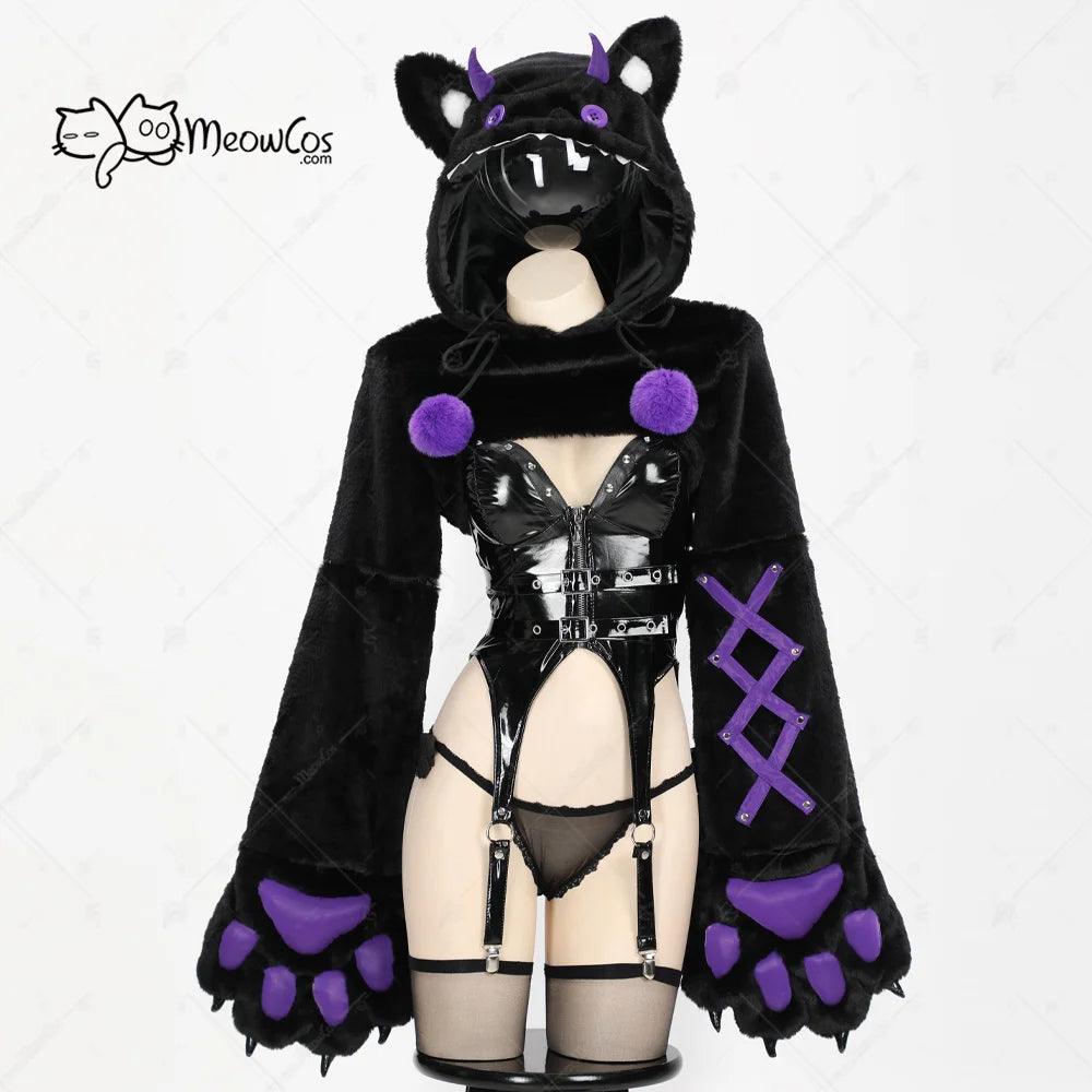 Introducing the MEOWCOS Women Gothic Sexy Lingerie Set with Hoodie Gloves, the perfect blend of allure and playful elegance. This unique lingerie set showcases a bold black and purple color scheme crafted from high-quality PU leather and luxurious velvet. Designed for those who wish to express their playful side, this lingerie set stands out in any setting.